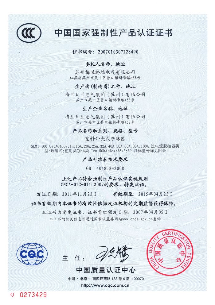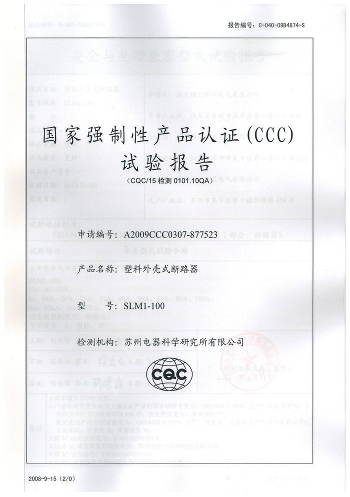 SLM1-100塑殼斷路器資質證書