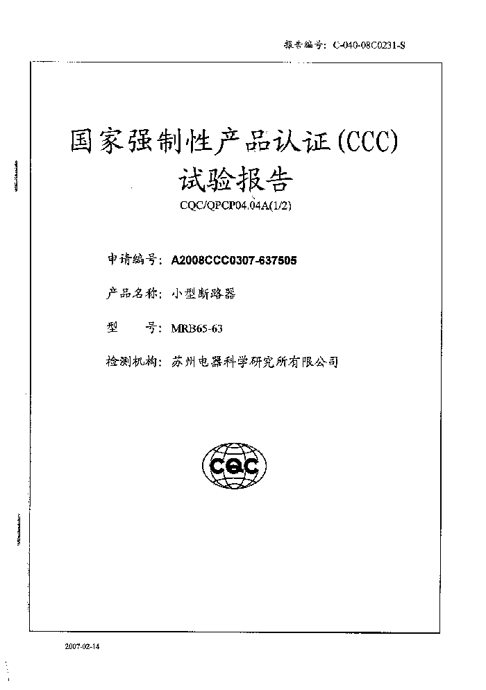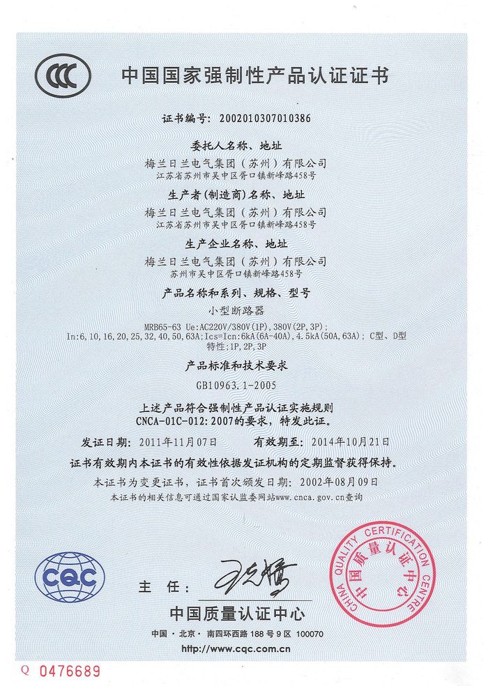MRB65-63小型斷路器資質(zhì)證書(shū)