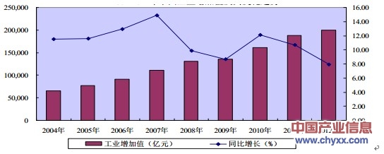 2004-2012年中國工業(yè)增加值及其變化趨勢