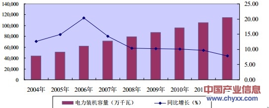 2004-2012年中國電力裝機容量及其變化趨勢