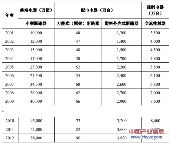 根據(jù)中國電器工業(yè)協(xié)會的統(tǒng)計,2001 年至 2012 年主要低壓電器產(chǎn)品的產(chǎn)銷量呈逐年上升趨勢,低壓電器產(chǎn)品保持較快速度增長,終端電器、配電電器、控制電器產(chǎn)量復合增長率分別為 21.86%、11.41%、10.50%,今后較長一段時間內我國低壓電器市場容量仍會穩(wěn)步增長。