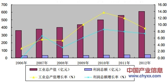 2006-2012年低壓電器行業(yè)工業(yè)總產(chǎn)值、利潤總額增長趨勢