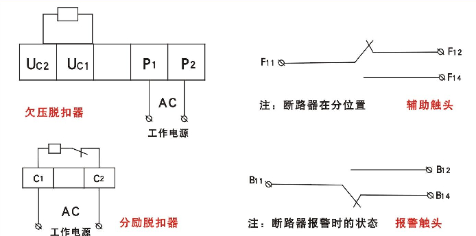 附件裝置分內(nèi)部裝置和外部裝置:內(nèi)部裝置有分勵脫扣器、欠電壓脫扣器、輔助觸頭、