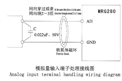 在某些模擬信號(hào)受到嚴(yán)重干擾的場(chǎng)合,模擬信號(hào)源側(cè)需加濾波電器或鐵氧體磁芯,如下圖